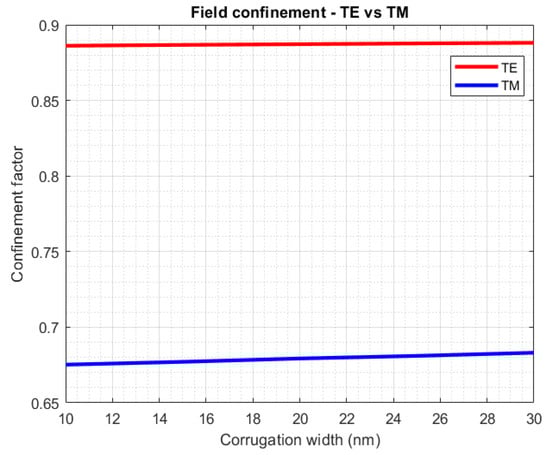 Confinement factor as a function of grating corrugation width for both TE and TM polarizations.