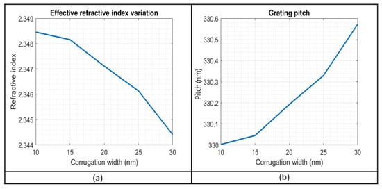 Figure 8a presents the effective refractive index for the fundamental mode, as a function of the corrugation width, to account for the effect of corrugation width in the , also shown in Figure 4. Through the expression , for , the corresponding grating pitch is calculated, and is presented in Figure 8b, for corrugation width within a range of 10 nm up to 30 nm.