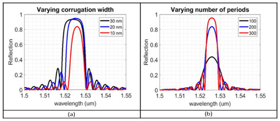 Change in reflection spectra, caused by a variation in: (a) corrugation width; (b) number of periods.