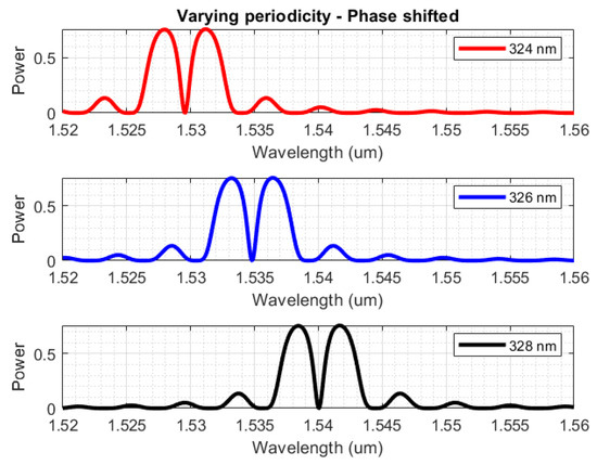 It is worth noting that a variant of regular Bragg gratings was also investigated, specifically, gratings with an unperturbed period in the middle of a regular structure (π-phase shift), causing a strong dip in the reflection lobe. This dip makes for a far more accurate tracking of the centre of the reflection lobe, and the design process is almost identical to that of the regular Bragg gratings [27]. Figure 10 shows some indicative spectrums for various configurations of the phase-shifted Bragg grating simulations, for a structure with dw = 20 nm and Λ = 324 nm, 326 nm, 328 nm, and 400 periods (200-phase shift-200). As expected, the variation of the grating pitch affects the lobe only in its spectral position.