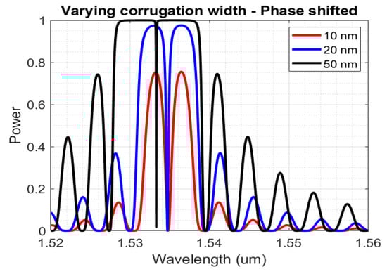 A significant change in the optical response can be observed, as shown in Figure 11, by varying the corrugation width of the Bragg grating. With a higher dw, the dip in the spectral response has its bandwidth value decreased. At 30 nm though, the 3 dB bandwidth of the dip is less than 40 pm. Τhis value will render the tracking of the dip more precarious during the characterization, considering the significant noise in the reflection spectrum, that is associated with the interfacing of the PIC to the fibre, with the total reflection spectrum of the sensor occupying a greater part of the spectrum. Therefore, the deployed sensors will have a 20 nm corrugation width.