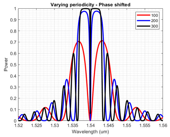 Reflection spectra for phase-shifted Bragg gratings with TE polarization, for configurations of Λ = 326 nm, dw = 20 nm, and periodicity of 100, 200, 300.