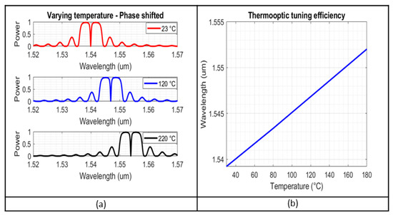After a range of values for the geometrical characteristics is selected, corresponding to the requirements for the peak reflectivity and the 3 dB bandwidth, the simulations for the temperature variation are carried out, based on the thermo-optic coefficient of silicon, of for wavelength values around 1.55 μm [28]. Figure 13a presents indicative reflection spectra affected by the variation of the ambient temperature, for the phase-shifted gratings, with Λ = 326 nm and dw = 20 nm and 200 periods.