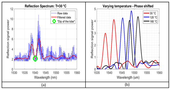 (a) Reflection spectra, raw data, filtered data and dip in the reflection lobe for 30 °C. (b) Filtered spectrum data for 3 different temperature levels.