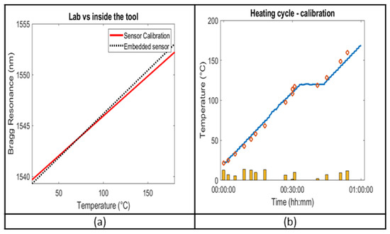 The data from the sensors integrated inside the tool can be compared to the calibration from the initial experimental testbed in the lab, as shown in Table 3. The two measurements are in agreement, validating both the calibration and the embedding process, with the greatest similarity in response being observed between 40 °C and 100 °C. The difference is mostly an effect of a divergence in the lab calibration, though the embedding of the sensors also may cause a slight shift in the resonance wavelength. Figure 15a shows the linear regression models for the sensor response, both in a laboratory setting and embedded in a tool, with respect to temperature. For a linear regression model with coefficients a,b in , please see Table 3.