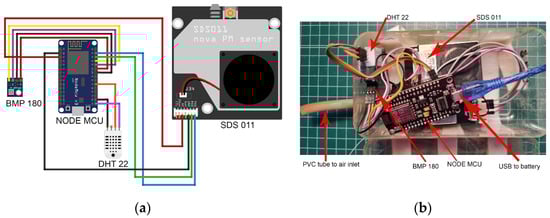We housed the sensors and the microcontroller in a plastic enclosure, in which we drilled one hole to insert a PVC tube 9 cm in length and 6 mm in diameter connected to the SDS011 air inlet. Note: Sensor.Community recommends a 20 cm inlet [], but we have used an even shorter one to minimize particle losses via impact. Six holes of 5 cm diameter were drilled into the opposite side of the enclosure to allow airflow. The low-cost dust monitoring system assembly, as well as the diagram of connections of the sensors to the Node MCU, are shown in Figure 1.