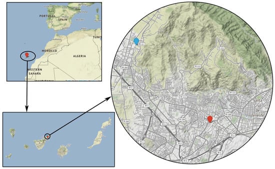 Our low-cost dust sensor was located outside a third-floor window in a four-story residential building facing a suburban street, at latitude 28°29′24.0″ N, longitude 16°18′36.0″ W, and height 558 m above sea level (a.s.l.) (Figure 2). The airborne dust levels at this site are mainly influenced by road traffic and occasional African dust intrusions since there is no nearby industrial activity or other sources of dust. Road pollution can also be considered fairly low, the closest road has low traffic, and the measurement site is close to green areas.