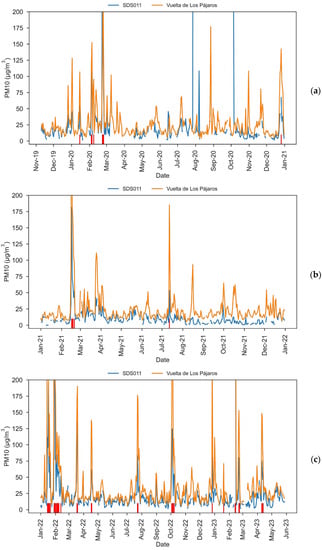 Daily PM10 measured with our SDS011 low-cost sensor (blue) and with the Vuelta de Los Pájaros reference monitor (orange) during the periods (a) 10 November 2019–31 December 2020, (b) 1 January 2021–31 December 2021, and (c) 1 January 2022–28 May 2023. Red vertical lines indicate days in which both sites were affected by African dust.