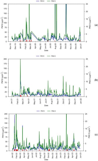 PM10 (blue) and PM2.5 (green) daily values measured with the low-cost dust sensor during the periods (a) 10 November 2019–31 December 2020, (b) 1 January 2021–31 December 2021, and (c) 1 January 2022–28 May 2023. Red vertical lines indicate days with PM10 > 37 μg/m3 which are African dust days according to METDC.