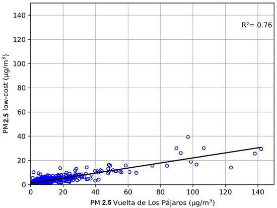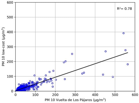 Correlation of daily PM10 concentrations at the low-cost sensor and the Vuelta de Los Pájaros reference monitor.