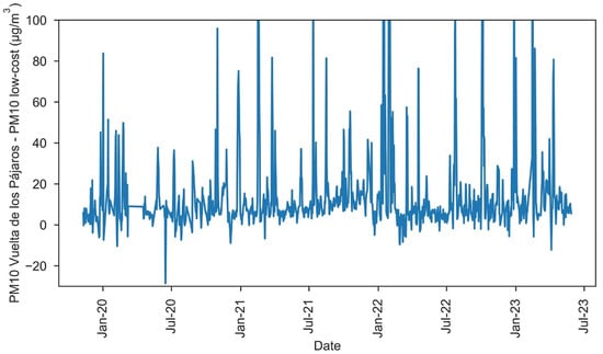 Examining the data in more detail, a shift in the absolute error seems to be observed in Figure 6 starting in February 2022. To verify the presence of this drop, MAE for the periods 10 November 2019–31 January 2022 and 1 February 2022–28 May 2023 were calculated, obtaining values of MAE = 15.9 μg/m3 and MAE = 14.7 μg/m3, respectively. Hence, our findings indicate that, since February 2020, the low-cost sensor has been measuring daily PM10 values 1.2 μg/m3 higher than before. It is worth noting that this change happened after an intense African dust outbreak, so that the high PM levels might have affected the sensor.