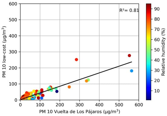 Correlation of daily PM10 concentrations at the low-cost sensor and the Vuelta de Los Pájaros reference monitor. The relative humidity measured with the low-cost DHT22 sensor is shown in different colors.