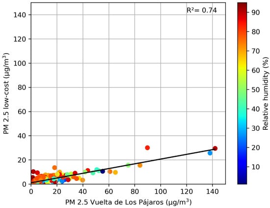 Correlation of daily PM2.5 concentrations at the low-cost sensor and the Vuelta de Los Pájaros reference monitor. The relative humidity measured with the low-cost DHT22 sensor is shown in different colors.