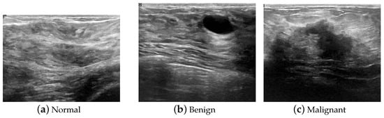 In general, to build an automatic diagnosis system, a dataset with correct labels under supervision is essential. In this work, we used the breast ultrasound images (BUSI) dataset [35] for training and testing. The data were collected from 600 women, in ages ranging from 25 to 75 years old, in 2018. The devices used in the scanning process were the LOGIQ E9 ultrasound system and the LOGIQ E9 Agile ultrasound system, which are commonly used worldwide, and the data had been previously stored in a DICOM format in the Baheya Hospital of Egypt, with a resolution of . The examination results were classified into three types: normal, benign, and malignant. The original ultrasound images from the patients are shown in Figure 1. After pre-processing and transformation of the format, the images were transformed from the clinically specified DICOM format into the more common PNG format, and the size of the images was approximately pixels, occupying approximately 350 kb in storage. Because the images were general to use and on a small scale, they were very suitable for H-ELM fast training for a lightweight model in applications.