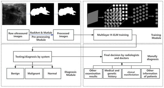 In this work, we aimed to build an automatic and efficient system for clinical images of breast cancer, and the design flow is shown in Figure 2. The total design can be divided into 4 modules: pre-processing of data, training the models, results for diagnosis, and manual diagnosis for final decision. To achieve the fast training speed and reduce time consumption, an ultrasound image is selected, since it is a popular choice because it is well tolerated by patients, widely available, does not require intravenous contrast or ionizing radiation, and is relatively inexpensive [36], compared to mammography, MRI, and biopsy, which may need more expense or harm and are more complicated in collecting. To realize fast training with fewer resources, each pixel of the ultrasound image is processed from gray-gradient into logic and keeps the essential shape and scale of the tumors at the same time. Then, the image is segmented into smaller sizes of pixels on Matlab, to further reduce the scale in processing.