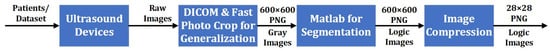 Before the diagnosis, the ultrasound images from different devices and patients should be generalized and processed before being sent to the system. In this work, we present a method of pre-processing images with general software, and the total process is shown in Figure 3. This work is designed for general usage in the early diagnosis of breast cancer, so the pre-process steps only require public software and a common image format of PNG. In practice, the format of the images collected from the ultrasound devices is DICOM, which may not be generally used by other systems or software. Thus, for the ultrasound breast cancer dataset, RadiAnt is used, which is a common software in medical and clinical settings, for transforming the format of images from DICOM into PNG format. Then, another software, named Fast Photo Crop, is used, to obtain ultrasound images with similar sizes, of pixels, or this part can be replaced by other tools to generalize the images, such as Matlab. Moreover, to improve the efficiency and accuracy of training and processing, the images are segmented further, because in the biomedical engineering area, image segmentation is the action of grouping pixels according to predefined criteria, in order to build regions or classes of pixels [41]. Therefore, considering the powerful learning abilities of the H-ELM, the images are further simplified from gray images into logic images, and reduce the sizes one more time. Here, ground truth (image boundary) is performed, to make the ultrasound dataset beneficial on Matlab, an easy segmentation is established, and the images are finally processed into binary images of pixels. The samples of mask images and simplified images are shown in Figure 4. After the process, the features of the tumors in the ultrasound images—such as the shape, location, and size—are also centralized, to some degree, which also helps to maintain accuracy in classification.