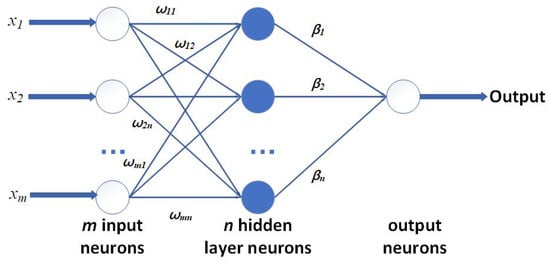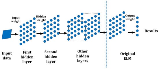 To build a stable and efficient H-ELM, several single-layer ELMs are used and connected one by one, and the structure of a single-layer ELM is shown in Figure 5. For the general single-layer ELM calculation process, the training set is shown in X: a set of N labeled pairs , where is the ith input vector and is the associate expected “target” value. Then, to calculate the output, the function of an ELM is written as
