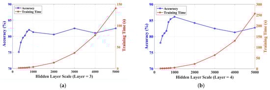 Accuracy and training time under different numbers of layers and hidden nodes: (a) trend of different scales of three-layer H-ELMs in accuracy and training time; (b) trend of different scales of four-layer H-ELMs in accuracy and training time.