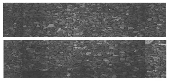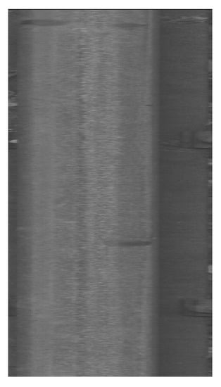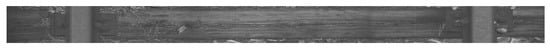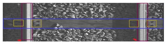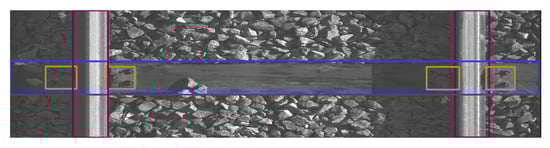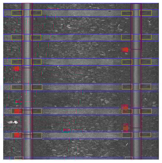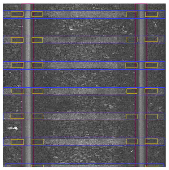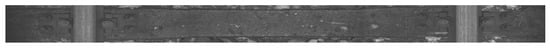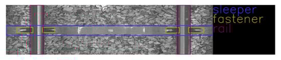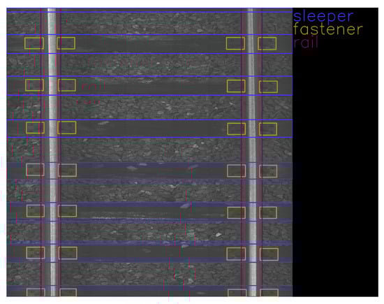 The data were collected on 2 March 2022 and 13 April 2022 at Warszawa Grochów motive power depot in Poland. All images are grayscale and come from line-scan cameras (raL4096-24gm - Basler racer, Basler AG, Ahrensburg, Germany). placed on the draisine running on the railway tracks. The photos contain track sections with wooden and concrete sleepers and do not contain switches. The dataset consists of 348 labeled images, including 299 short images of size 2083 px × 500 px and 49 long images of size 2083 px × 2100 px. Rails, sleepers, and fasteners are labeled on the images with bboxes. Figure 8 and Figure 9 show the annotations of short and long photos, respectively.