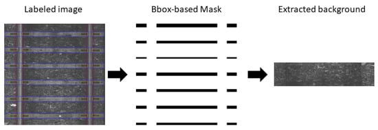 In this Section, we describe our novel method, named Background Image Extraction (BIE), which cuts out areas without bboxes from the railway photo and then joins them into a new image. Adding background images to the training set is a common procedure to improve model performance—the same stands for detecting railway components where the background consists mostly of ballast. Adding background images with no objects to detect to the training phase allows neural networks to learn what they should avoid detecting, which improves the performance of their predictions. Due to the distinctive composition of the railway track, we came up with a railway-targeted method of extracting background images. Figure 6 shows the general idea behind BIE. A bbox-based mask is extracted based on a labeled image based on the position of the track component. Then, a mask is used to cut out areas in the image that are merged into a new background image.