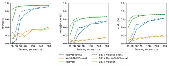 Figure 10 shows the relationship between the training subset size and model performance. The plot shows that for training subsets that consist of 120 or fewer observations, YOLO models trained with BIE performed better than their variants trained without BIE. For training subsets containing more than 120 observations, there was no noticeable improvement of the YOLOv5n model trained with BIE when compared to its variant trained without BIE. Nevertheless, including background images in training subsets larger than 120 observations improved YOLOv5s-ghost. MobileNetv3-small did not show a noticeable quality increase after adding background images. The plots show that for training subsets consisting of more than 120 observations, the relative improvement of YOLOv5n’s performance is slight. Therefore, 120 is a sufficient number of observations to train an accurate model. In addition, when BIE is applied, even 90 observations are enough to achieve the same performance as 120 observations without BIE. YOLOv5n, compared to YOLOv5s-ghost and MobileNetv3-small, consists of a smaller number of parameters; therefore, it is expected to require fewer observations to achieve a good performance, which is consistent with the experimental results. BIE augments the training set with additional background images to teach algorithms which objects should not be detected and it can be seen that for small datasets it does indeed improve the quality of YOLO models. In contrast, it does not improve the quality of MobileNet, presumably because the model consists of the largest number of parameters and needs a larger volume of data.