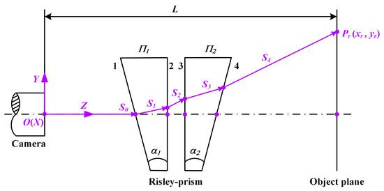 In order to analyze the imaging characteristics of the Risley prism, an inverse ray tracing model of the system [28] is established based on the theoretical model of Figure 1, as shown in Figure 2, which describes in detail the deflection process of the light beam passing through the Risley prisms. The center of the circle on the outer surface of the camera lens is set as the origin, and a Cartesian coordinate system is established. The four surfaces of the prism are labeled as 1, 2, 3, and 4 in the direction away from the camera lens, and the unit normal vectors of the four surfaces are and , which can be expressed as: