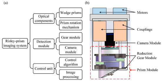 The Risley-prism-based imaging sensor is a typical optomechanical pointing system, which involves the integration of several subsystems, mainly the image recognition system, the beam pointing model, and the prism control system. The Risley-prism-based imaging sensor has high stability and high precision optical imaging performance, which generally consists of an optical receiving element, detection module, and control unit [40], as shown in Figure 3a. The optical element module is mainly designed to change the pointing position of the outgoing beam to achieve spatial orientation scanning and determine the FOV range where the target is located. The module is composed of optics, mainly two wedge-shaped prisms placed co-axially in an integrated mirror holder. The detection module includes a gear transmission group and a camera module. The gear transmission module contains motors, couplings, and reduction gears that drive the rotation of the prism frame; the camera module is mainly a camera and is mounted co-axially with the prism group; the main function of the detection module is to change the relative rotation angle between the prisms to achieve the visual axis scanning and pointing, and the specific structure is shown in Figure 3b. The decision-making unit of the whole system is the system control chip, which mainly deals with two core matters: controlling the rotation of two motors and collecting and processing image information.