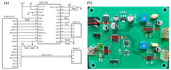 In order to realize the angle control of the prisms, a motor control circuit is designed as shown in Figure 4, where (a) represents the schematic diagram and (b) is the printed circuit board. The STM32f1 series chip is selected as the main control unit, and the Trinamic TMC2209 chip is selected as the driver of the motor. The computer communicates with the control unit through serial communication, thus realizing the control of two motors.