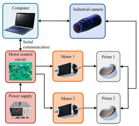 The control system design of the Risley-prism-based imaging sensor is shown in Figure 5, which mainly consists of a computer, a motor control circuit, a power supply, two motors, two prisms, and an industrial camera. The computer sends commands to the motor control circuit through serial communication to drive the motor to rotate, which makes the prisms deflect from each other, thus driving the camera FOV to move. The industrial camera is used to acquire images.