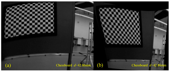 The essence of aberration correction is to transform the pixel points in the image one by one through the nonlinear model in Equation (12). The steps of image aberration correction for the calibration method are as follows: the first step is to pre-process the calibration plate image dataset obtained from the above shots by bicubic interpolation; the second step is to extract the detected corner point information of each image; the third step further extracts its sub-pixel corner point information; the fourth step uses these corner point information to find out the internal and external parameters of the camera and the actual radial aberration coefficient; the fifth step uses the Levenberg–Marquardt algorithm to nonlinearly optimize the parameters.