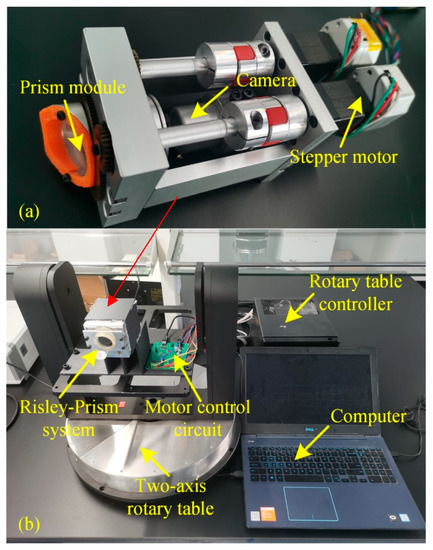 The physical diagram of the Risley-prism-based imaging sensor designed is shown in Figure 7a, whose mechanical parts are produced by precision five-axis machine tools to greatly ensure the co-axially between the camera view axis and the prism optical axis. The combination of precision motion control technology and software algorithms can realize the control of the prism’s rotation angle easily and with high accuracy.