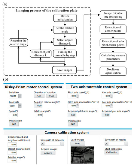 The overall flow diagram of the calibration method is illustrated in Figure 8a, and the user interface is shown in Figure 8b. The process of quickly obtaining the calibration plate image dataset: first, before calibration, the camera bracket needs to be adjusted to make the camera view axis coincide with the rotation center of the two-axis turntable and initialize the system; then, set the relative rotation angle of the Risley prisms and the distance L between the calibration plate and the camera; next, adjust the angle of the turntable so that the calibration plate is located at the top left and bottom right of the image in the camera, respectively, and record the X- and Y-axis rotation positions of the turntable for both cases; in the next step, select the appropriate rotation step in X and Y directions, take one picture per rotation step, and then take a picture of the calibration plate evenly distributed in FOV of the camera and save it; finally, reselect the relative angle of the Risley prisms and the distance L, and repeat the above steps.