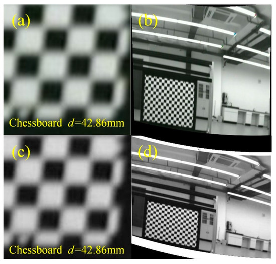 Figure 9 shows the comparison images before and after pre-processing with the bicubic interpolation algorithm. It can be seen that when the distance between the calibration plate and the camera is far, and due to the dispersion caused by the Risley prism, the corner points are blurred when imaging, which leads to the error of the later algorithm in recognizing the corner points, while the corner points can be recognized normally after the pre-processing of the image with the bicubic interpolation algorithm. The effect of taking the pre-processed calibration plate image for distortion correction at the same time is shown in Figure 9d, and the correction effect is better, which indicates that the bicubic interpolation has a better effect of increasing pixels.