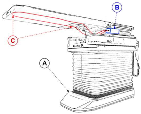 Schematic depiction of the components of the measurement device and its setup on the treatment couch. (A) The foot of the couch of the accelerator. (B) The signal treatment unit composed of a battery, two photomultipliers, a signal analysis controller, and a Bluetooth emitter. (C) The optical fiber, which is securely taped beneath the couch top. The two arrows point to the beginning and the end of the scintillating part of the fiber.