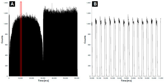 Counts as a function of time (ms) during a CBCT acquisition with 360° rotation of the source (A) and a zoomed view of (A) inside the red boundaries showing the pulsed emission of X-rays from the kV source (B).