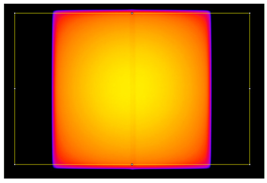 First, we acquired posterior 10 cm × 10 cm 6 MV Flattening Filter-Free (FFF), 6 MV with flattening filter, and 18 MV fluence [27] images with the electronic portal imaging device (EPID) of the TrueBeam both with and without the device. During these measurements, a 10 cm thick RW3 slab phantom (PTW-Freiburg®, Freiburg, Germany) was placed on the table at the isocenter in order to reproduce a beam going through a volume with a density close to water. The Digital Imaging and Communications in Medicine standard (DICOM standard) images were analyzed using the open-source image-processing program ImageJ version 1.53v [28]; specifically, a large region of interest (ROI) encompassing the majority of the beam was used to compute an average profile in the left/right direction (Figure 4). The images with and without the fiber were then compared in terms of normalized intensity.
