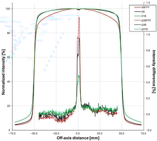Normalized intensity profiles (solid lines, left vertical axis) of 10 cm × 10 cm 6 MV FFF, 6 MV, and 18 MV fluence images acquired with the electronic portal imaging device (EPID) in the presence of the fiber with a 10 cm thick RW3 phantom at the isocenter. The absolute differences between the profiles when the fiber was absent are also shown (dashed lines, right vertical axis).