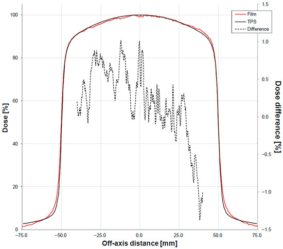 Second, we placed an EBT3 Gafchromic® film (Ashland Advanced Materials, Bridgewater, NJ, USA) at the isocenter in the middle of a 10 cm RW3 slab phantom to reproduce a measurement inside a volume of density close to the patient and irradiated the film with a 2 Gy dose with a posterior 10 cm × 10 cm 6 MV FFF beam. The film was scanned before and after irradiation with an Epson® Expression 10000XL scanner (Seiko Epson Corp.; Suwa, Japan). The dose analysis was performed with in-house Java software version 8, in which 3-color conversion and film homogeneity correction were implemented by using the non-irradiated image. The analysis was conducted using the same methodology as described above for the EPID images, except that the reference profile (i.e., without the dosimeter) was calculated by the Varian Eclipse 16.1 Treatment Planning System (TPS) (Varian Medical Systems, Palo Alto, CA, USA) using the Accuros XB 15.6.04 algorithm with a 1 mm calculation grid size and the same geometry.