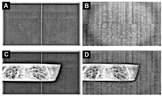 Planar images acquired using a posterior incidence without (A,B) and with (C,D) an in-house 3D-printed thoracic phantom using the “Extremity” (65 kV and 3.5 mAs; (A,C)) and “Thorax Small” (80 kV and 5.0 mAs; (B,D)) acquisition protocols.
