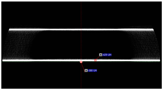 The fourth test involved visually assessing axial CBCT images acquired in the presence of the fiber without a phantom using the “Head Full Fan” protocol with 100 kV and 270 mAs. Figure 8 shows the carbon treatment couch (two horizontal white lines) with an example of a point measurement (−429 Hounsfield Units (HU)) and the fiber beneath the couch with another point measurement (−580 HU).