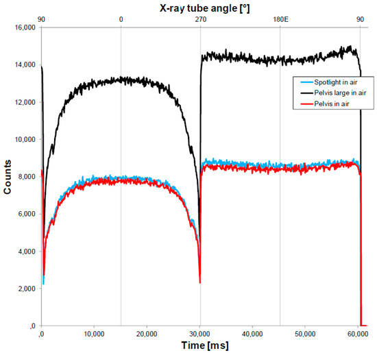 Number of counts measured in air by the device as a function of time (ms) and the X-ray tube angle (°) for the three CBCT protocols (Pelvis, Pelvis Large, and Spotlight).