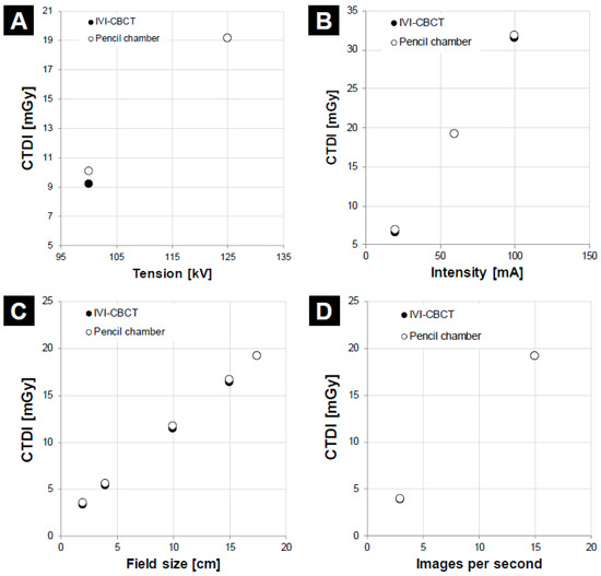 Plots showing the CTDI in mGy measured by the IVI-CBCT dosimeter and the pencil chamber when the Pelvis protocol was used, but the tube voltage [kV] (A), tube current [mA] (B), field size [cm] (C), or number of images per second (D) was altered.