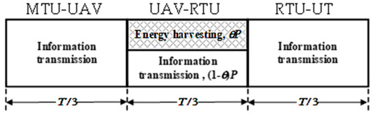 In the intended communication, the entire time frame period, T, is divided into three equal time slots, as shown in Figure 2. The first time slot is used for the MTU-UAV information transmission, the third slot is used for the RTU-UT information transmission, while the second time slot is determined for both the UAV-RTU information transmission and the energy harvesting. During the second time slot, the part of the total power P of the received signal, θ × P, is utilized for the harvesting, while the rest of the power (1 − θ) × P is dedicated to the UAV-RTU information transmission. The parameter θ (0 ≤ θ ≤ 1) denotes the power-splitting factor.