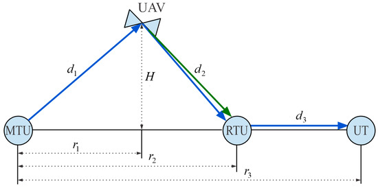 The location of each network node is determined in the cylindrical coordinate system as MTU(r0, φ0, h0), UAV(r1, φ1, h1), RTU(r2, φ2, h2), and UT(r3, φ3, h3). For the sake of simplicity, the coordinates of the nodes’ positions, for the presented numerical results, are MTU(0 m, 0 rad, 0 m), UAV(r1, 0 rad, H), RTU(400 m, 0 rad, 0 m), and UT(450 m, 0 rad, 0 m). Consequently, the system model can be redrawn as in Figure 3. The distances between nodes di, i = 1, 2, 3, are defined by the Euclidean norm. Further, the following system parameters are set as θ = 0.8, δ1 = δ2 = δ3 = 2.05, , and . In addition, the fading parameters that describe conditions of channels are set as m1 = 5 for the MTU-UAV link, m2 = 2 for the UAV-RTU link, and m3 = 3.5 and ms3 = 5 for the RTU-UT link.