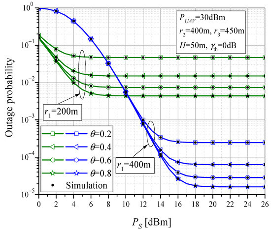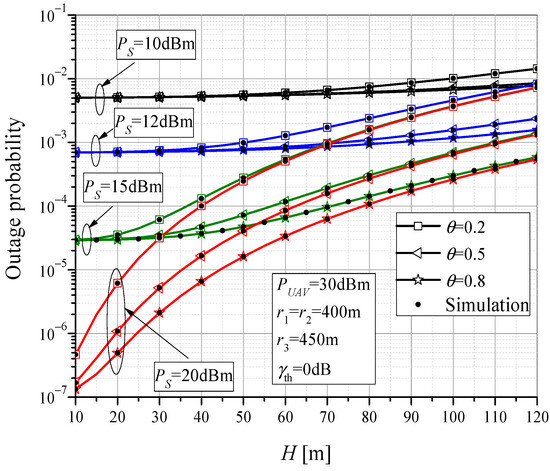 In Figure 5, the outage performance dependence on the UAV altitude is shown, for the case when the UAV is above RTU (r1 = r2 = 400 m). Numerical and simulation results are obtained for different values of MTU transmit power PS and power-splitting factor θ. For lower values of PS, the MTU-UAV link represents the critical one for the outage, resulting in a higher probability of system failure. In this case, the influence of the amount of harvested energy and the influence of UAV altitude is not significant. By increasing the MTU output power, the probability of an outage event dominantly depends on the failure of the rest of system, and thus the power-splitting ratio has a significant impact on the system outage. The performance improves when the collected energy on the RTU is higher, i.e., when θ is larger. In addition, with increasing UAV position height, the outage probability increases due to higher path-loss, and the influence of UAV altitude on the performance is significant.