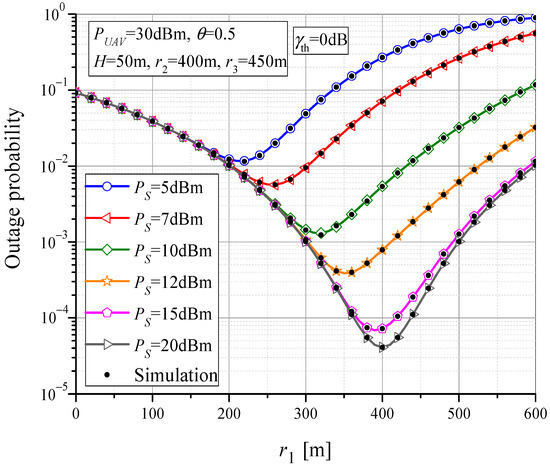 The dependence of the outage probability on horizontal MTU-UAV distance for various values of PS is presented in Figure 6. When the UAV is located closer to the MTU (r1 < 200 m), the impact of the transmitted MTU power on the outage probability is negligible, and by increasing the distance r1, the outage probability decreases. For the certain horizontal MTU-UAV distance value, the minimum probability of outage occurs. The outage probability increases with the further increase in r1. This effect can be intuitively explained by the fact that if the wireless power transfer is applied for the RTU power supply, the best performance is obtained when the UAV is directly above the RTU. However, this fact is valid only for higher values of PS; thus, the outage of the MTU-UAV link does not affect the overall outage performance. In general, the optimal location of the UAV that contributes to the minimum of the outage probability is located between the MTU and the RTU. For smaller values of PS, the optimal performance is obtained when the UAV is positioned closer to the MTU, and vice versa. The best outage performance is obtained in the case of high MTU output power, when the UAV is positioned directly above the RTU, which harvests the energy from the UAV.