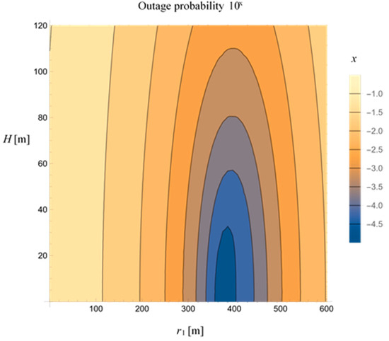 The contour plot of the outage probability dependence on the UAV position defined by (r1, H) is presented in Figure 7, for PS = 15 dBm, PUAV = 30 dBm, and θ = 0.5. The results present a set of values of the UAV height H and the MTU-UAV horizontal distance r1, which lead to the predefined outage probability. When the UAV is positioned at a certain height, changing the MTU-UAV horizontal distance could lead to the predefined outage probability and vice versa. For instance, to obtain an outage probability smaller than 10−3, the distance r1 should be in the range whereby the height of the UAV can be up to 110 m. To achieve an outage probability smaller than 10−4, the r1 distance should be between 350 m and 450 m, while the maximal UAV’s height H can be around 50 m.