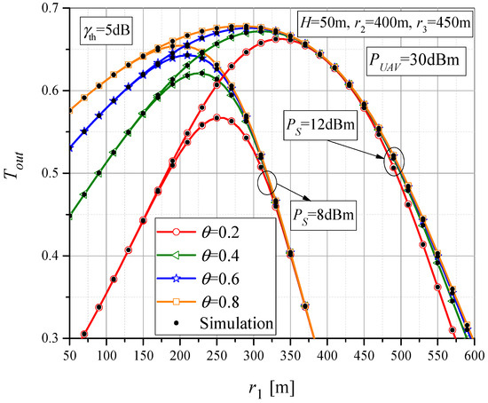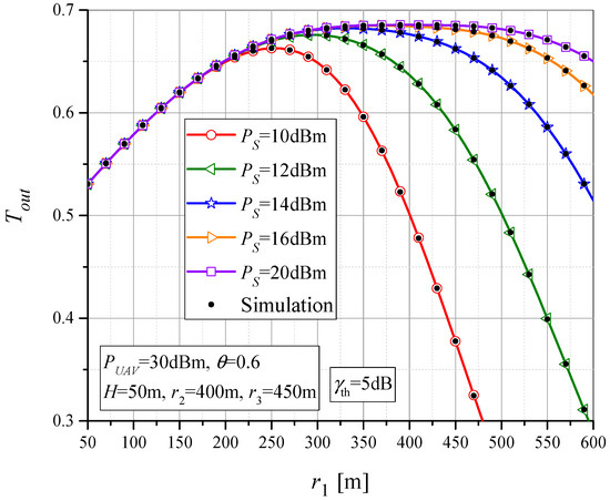 In Figure 8, the throughput Tout is shown as a function of MTU-UAV horizontal distance, r1, for parameter values θ = 0.7, H = 50 m, and γth = 5 dB. The results are presented for different values of MTU output power, PS. It can be noticed that for each value of PS, there is an optimal UAV position at which maximum throughput is achieved. When the UAV is closer to the MTU, the transmitted MTU power does not affect the throughput and it is determined by the UAV-RTU-UT subsystem. However, as the UAV-MTU distance increases, the throughput also increases due to smaller UAV-RTU distance. At a certain distance r1, the maximum throughput can be reached. With the increase in MTU transmit power PS, the value of maximum throughput also increases and it is achieved for higher values of distance r1. With a further increase in r1 (beyond the one that maximizes throughput), the throughput decreases and the overall system performance deteriorates.