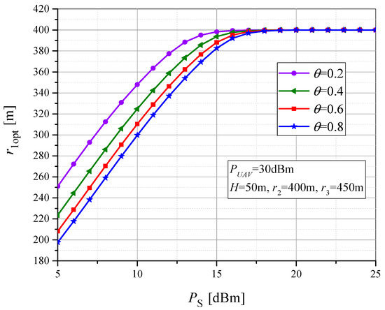 Figure 9 shows the dependence of the optimal value r1 on the power-splitting factor θ (and therefore on the amount of collected energy at the RTU). In order to investigate the dependence of the optimal value of the horizontal position between the UAV and the MTU on the power-splitting factor and the MTU transmit power, we present the results in Figure 10. For PS = 10 dBm and θ = 0.8, the optimal horizontal UAV-MTU distance is r1opt = 300 m, while for θ = 0.2, the optimal value is r1opt = 350 m, due to the smaller value of the collected power at the RTU. Therefore, in the case of smaller power-splitting factor values, the optimal position r1opt is higher in order to reduce the UAV-RTU distance and corresponding path loss. When PS > 18 dBm, the optimal MTU-UAV horizontal distance is independent of the power-splitting factor and corresponds to the position when the UAV is above the RTU.