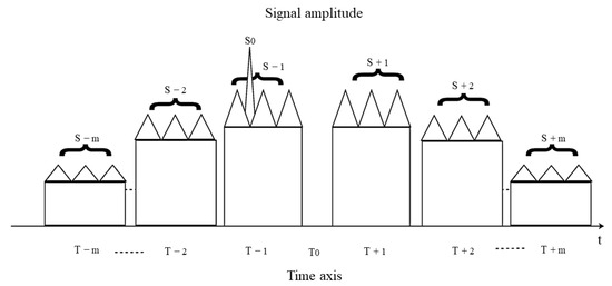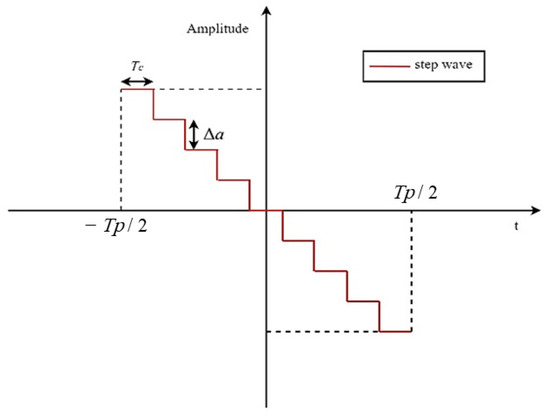 As depicted in Figure 2, the time-domain waveform of the uniform step wave exhibits a variation range in amplitude, consisting of sequentially decreasing rectangular waves. The modulated step wave signal shares the same pulse width as that of the LFM signal. The amplitude difference between each segment’s pulse width, and the adjacent segments can be mathematically expressed as: